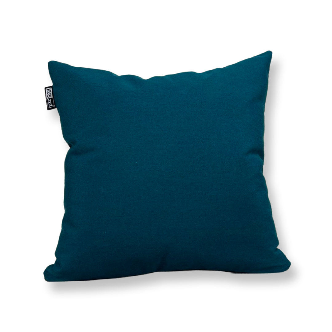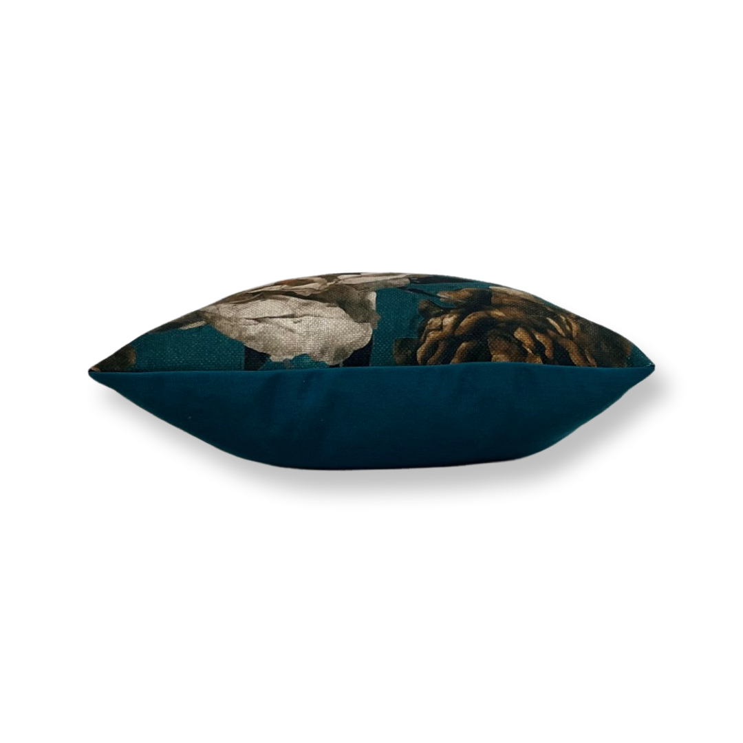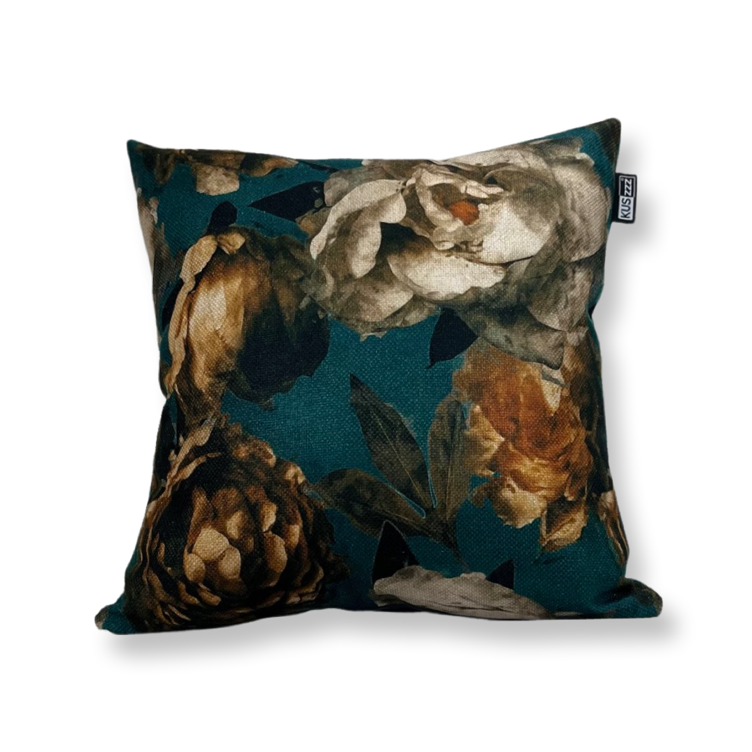 Sierkussen van 40x40cm bestaande uit twee materialen. Een hippe bloemenstof en een blauwe achterzijde. De binnenhoes is gevuld met wattine.