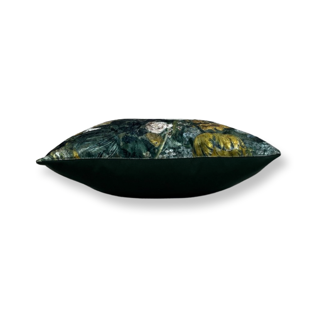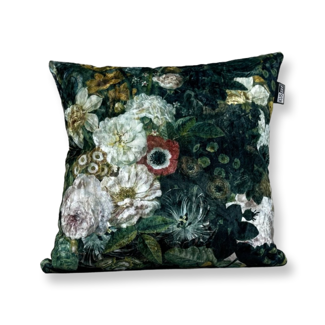 Sierkussen van 40x40cm bestaande uit twee materialen. Een hippe bloemenstof en een groene achterzijde. De binnenhoes is gevuld met wattine.