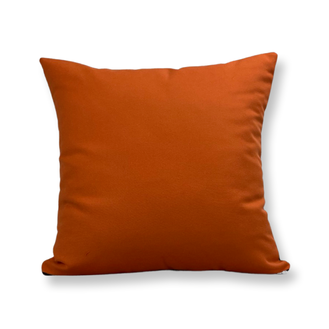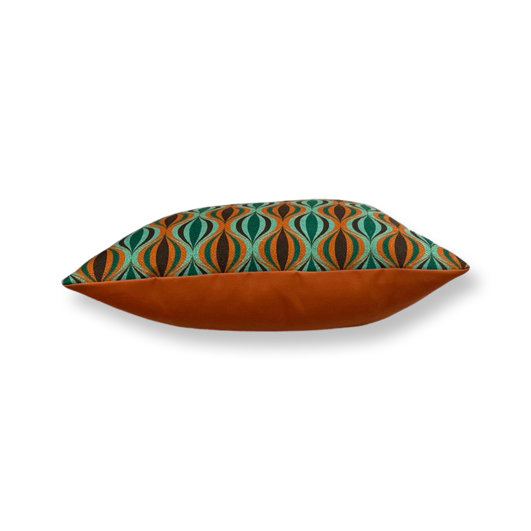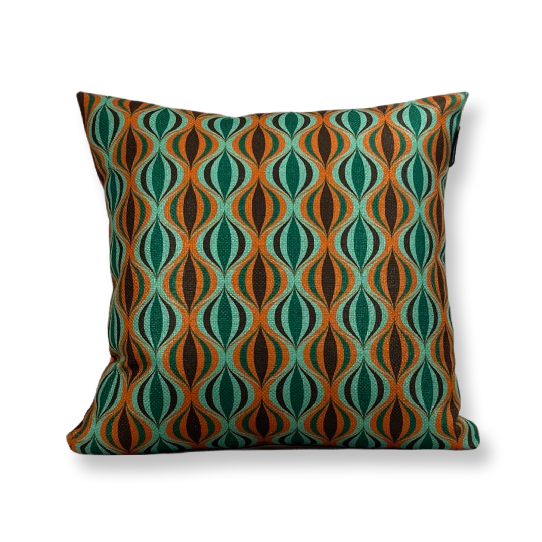 Sierkussen van 40x40cm. Een retro stof met een oranje achterzijde. De binnenhoes is gevuld met wattine.