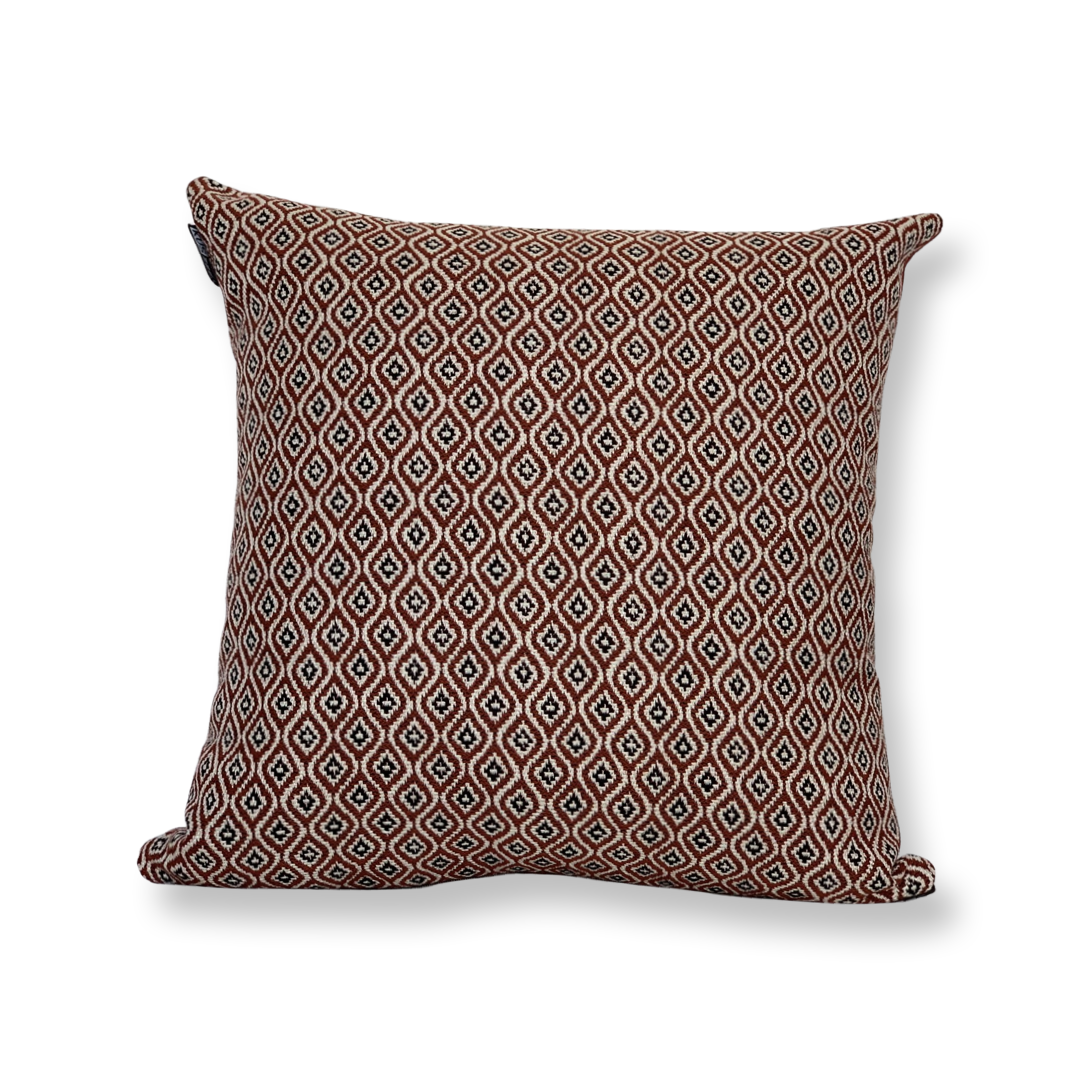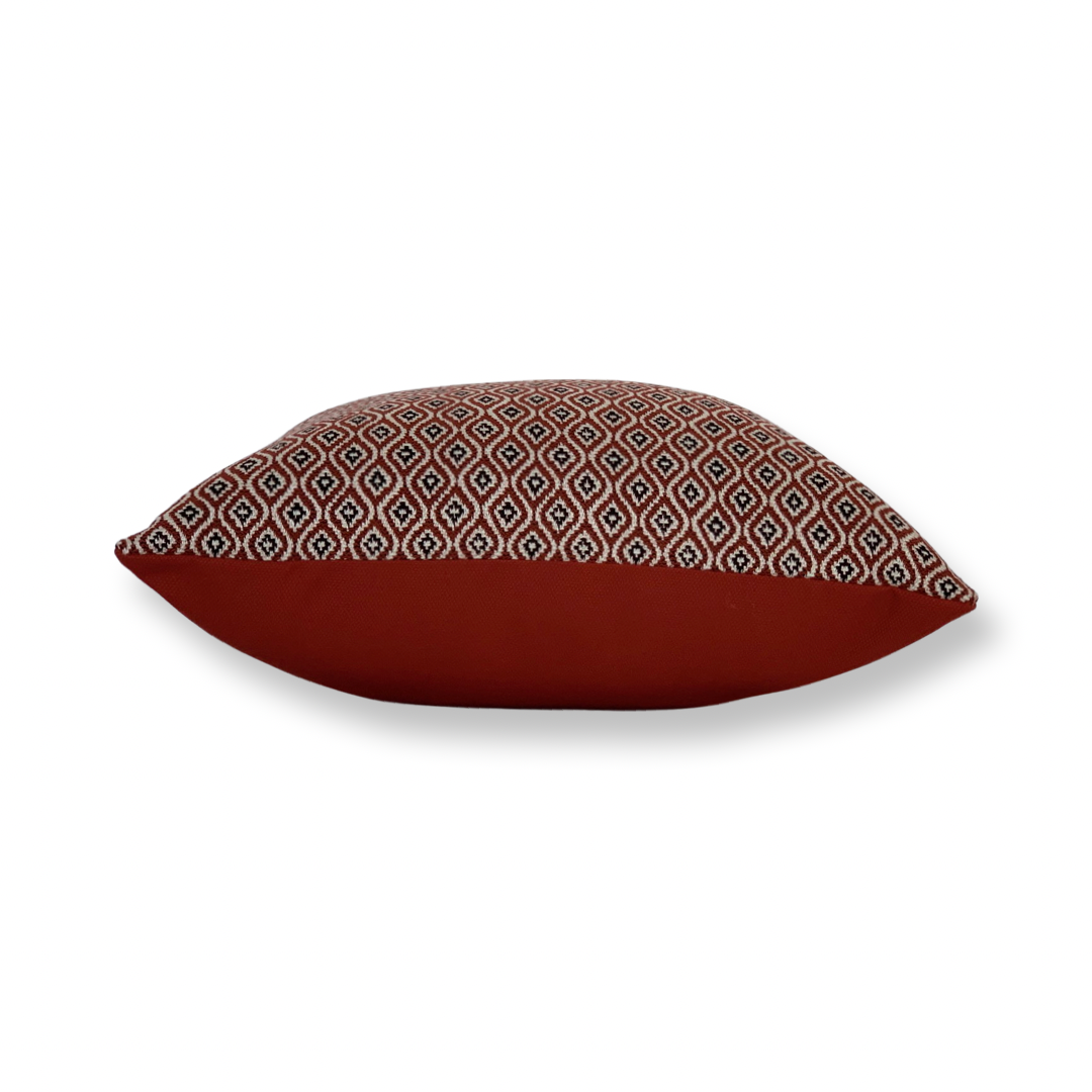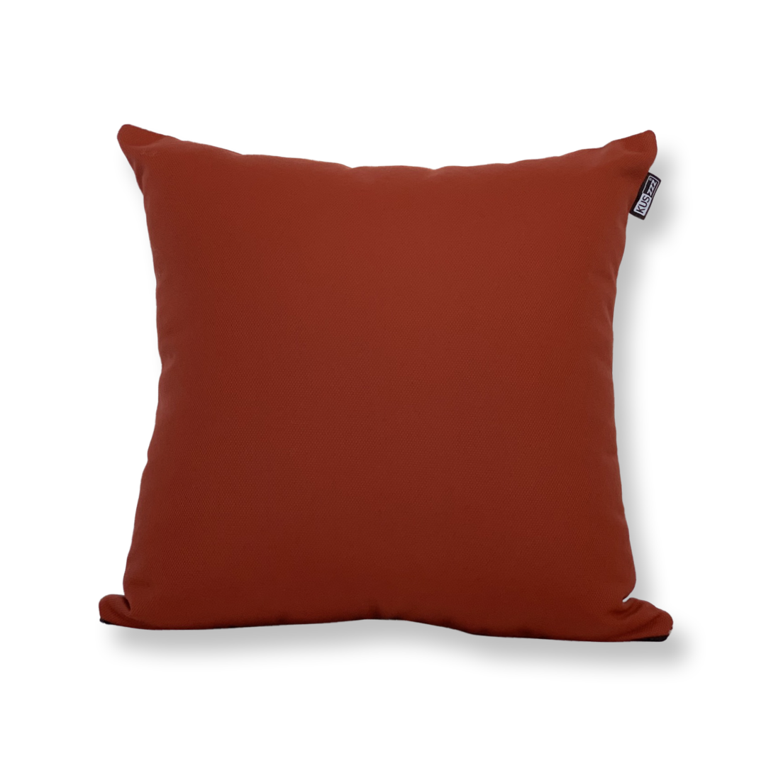 Sierkussen van 48x48cm geschikt voor buiten. Gemaakt van Sunbrella Komo stof met een effen rode achterzijde. De binnenhoes is gevuld met wattine.