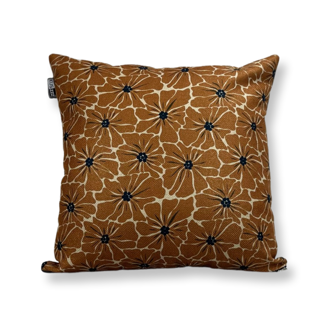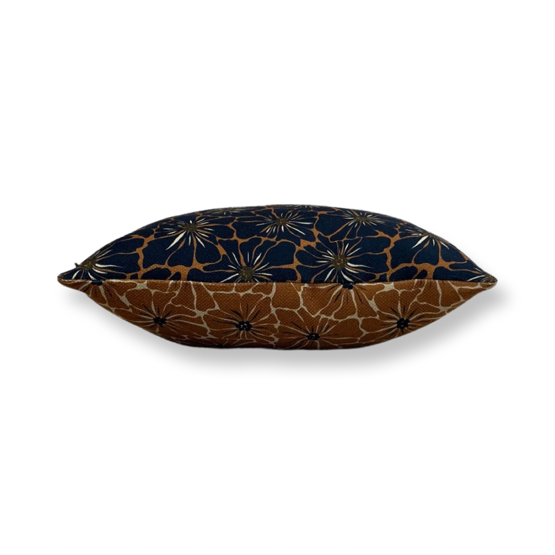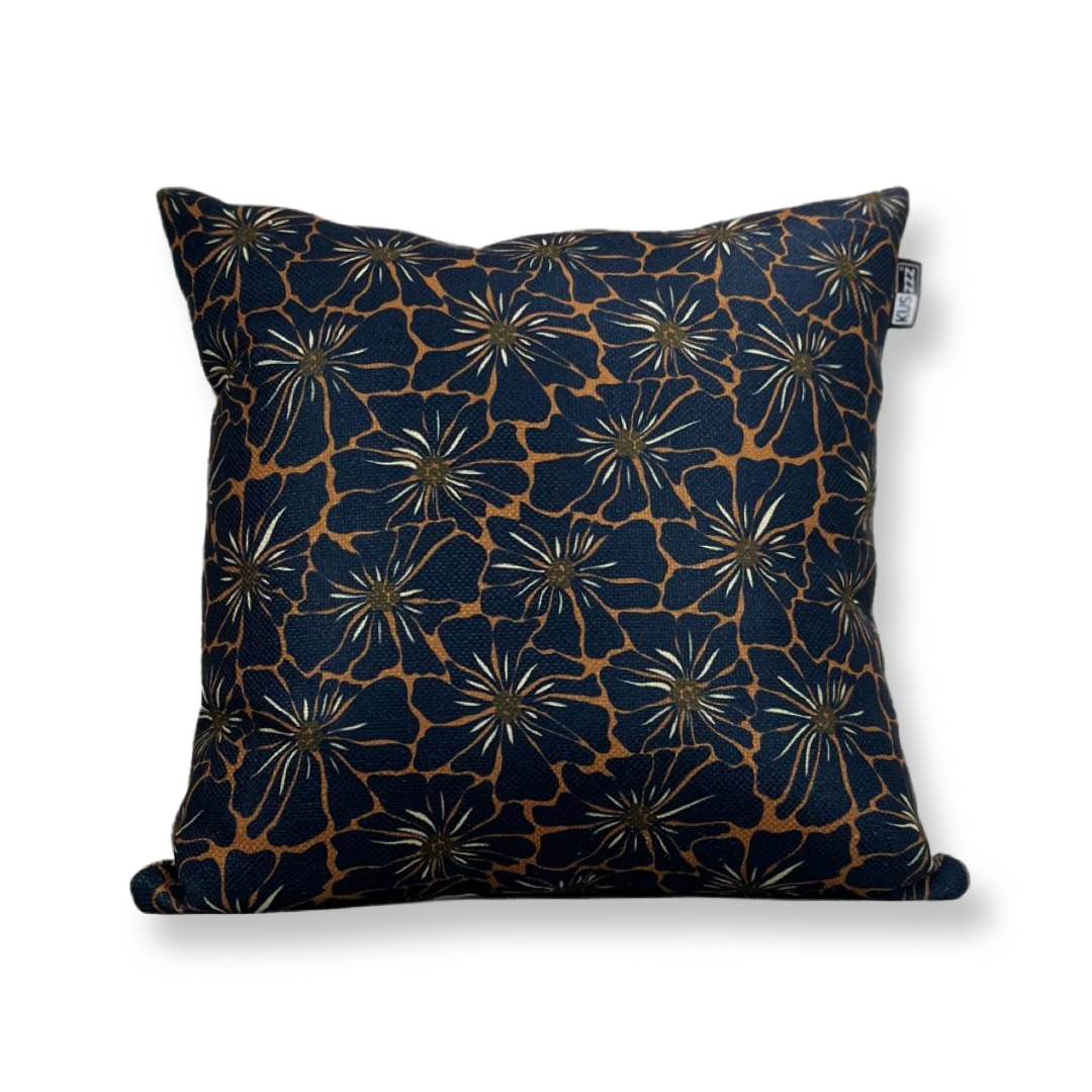 Sierkussen van 40x40cm bestaande uit blauwe -en bruine bloemen. De binnenhoes is gevuld met wattine.