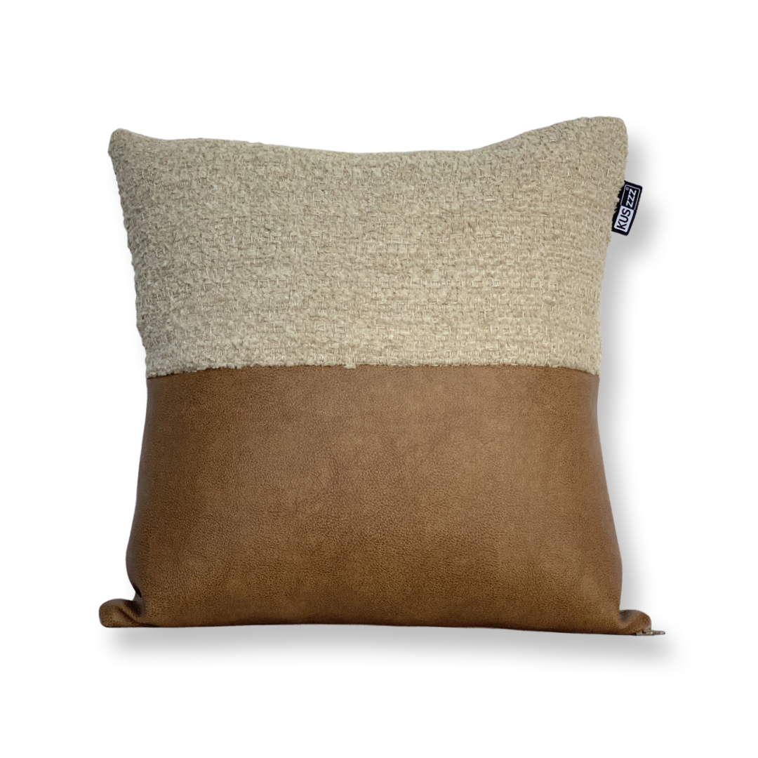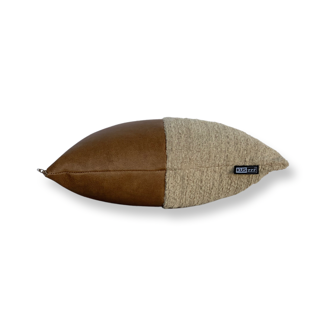 Sierkussen van 40x40cm bestaande uit twee materialen. Een teddy stof en een stoer kunstleer. De binnenhoes is gevuld met wattine.